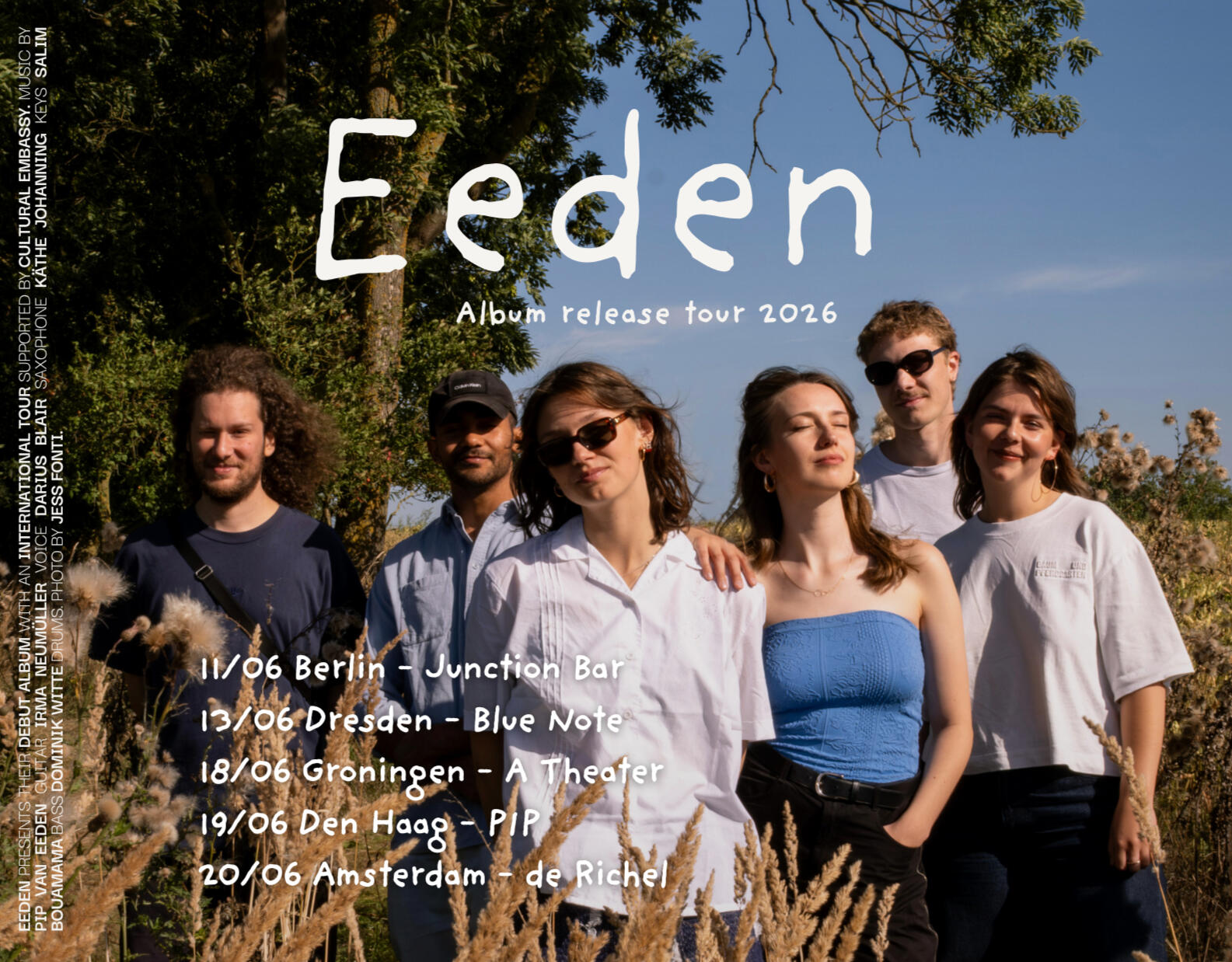 Eeden is a young, Berlin-based singersongwriter/jazz band founded by guitarist and composer Pip van Eeden in 2024. Eeden plays deeply personal songs, inspired by artists like Lianne la Havas, Olivia Dean and Alice Phoebe Lou. In 2025, they proudly secured second place at the prestigious Sparda Jazz Award.Eeden will take you into their own little universe, with lyrical solo’s, soulful melodies and lyrics filled with metaphors and contradictions. Combining their love for soul, singer-songwriter and jazz, the band Eeden makes music that intertwines the gentle with the complex, creating pieces that feel both familiar and refreshingly new. The jazz background of the musicians breathes depth into the simple, while keeping their songs honest, vulnerable, intimate and real. After listening you’ll land back on earth feeling a little warmer than you did before.